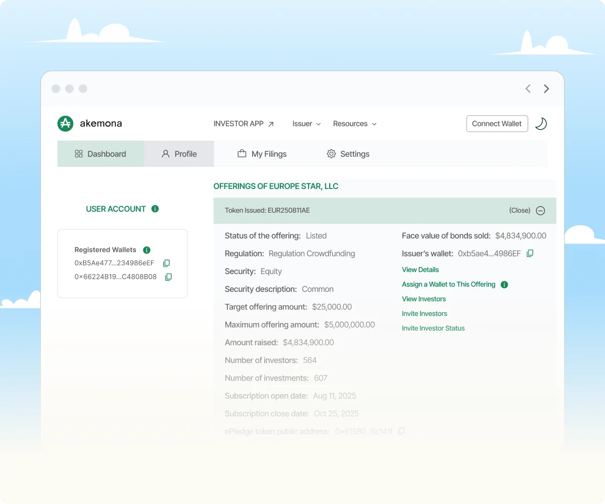 Use the Akemona Tokenization Cloud to issue digital assets, from securities and stablecoins to utility tokens, under SEC exemptions.